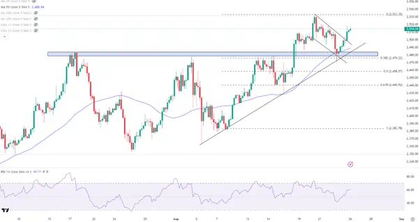 具体来看,4小时图上突破调整通道后,金价正在向上周创下的历史高点2531发起冲击。下行方向,50MA即2488附近是初步支撑,但更为关键的是颈线2470/80一带,上周金价从这里开始反弹。