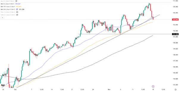 经历了上周五的重挫后,美/日短线正在遭遇回调压力,周一开盘后继续考验上周低点153.90,关注趋势线和均线或能否提供缓冲帮助汇价延续升势。