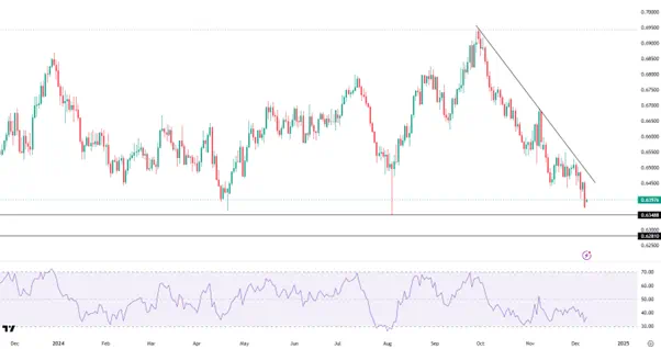 对于已经跌至年内新低的澳元来说,急需内部(央行维持鹰派及乐观经济数据)和外部(地缘风险可控以及大宗商品价格回暖)的积极因素的帮助来摆脱当前的颓势,而要同时达成上述条件难度较大。因此本周汇价或继续面临下行风险,下方关注8月低点0.6350以及0.6280等前低位置。