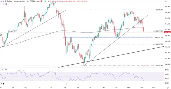 技术走势方面,在跌破9-1月的上升趋势后,美/日加速下行失守200天均线,日内首先关注151.50附近的支撑。不断收窄的美日利差或令汇价进一步承压下探前低149一线即50%回撤位,其次是更为关键的145.80附近,这里是2020年以来的上升趋势线所提供的支撑。