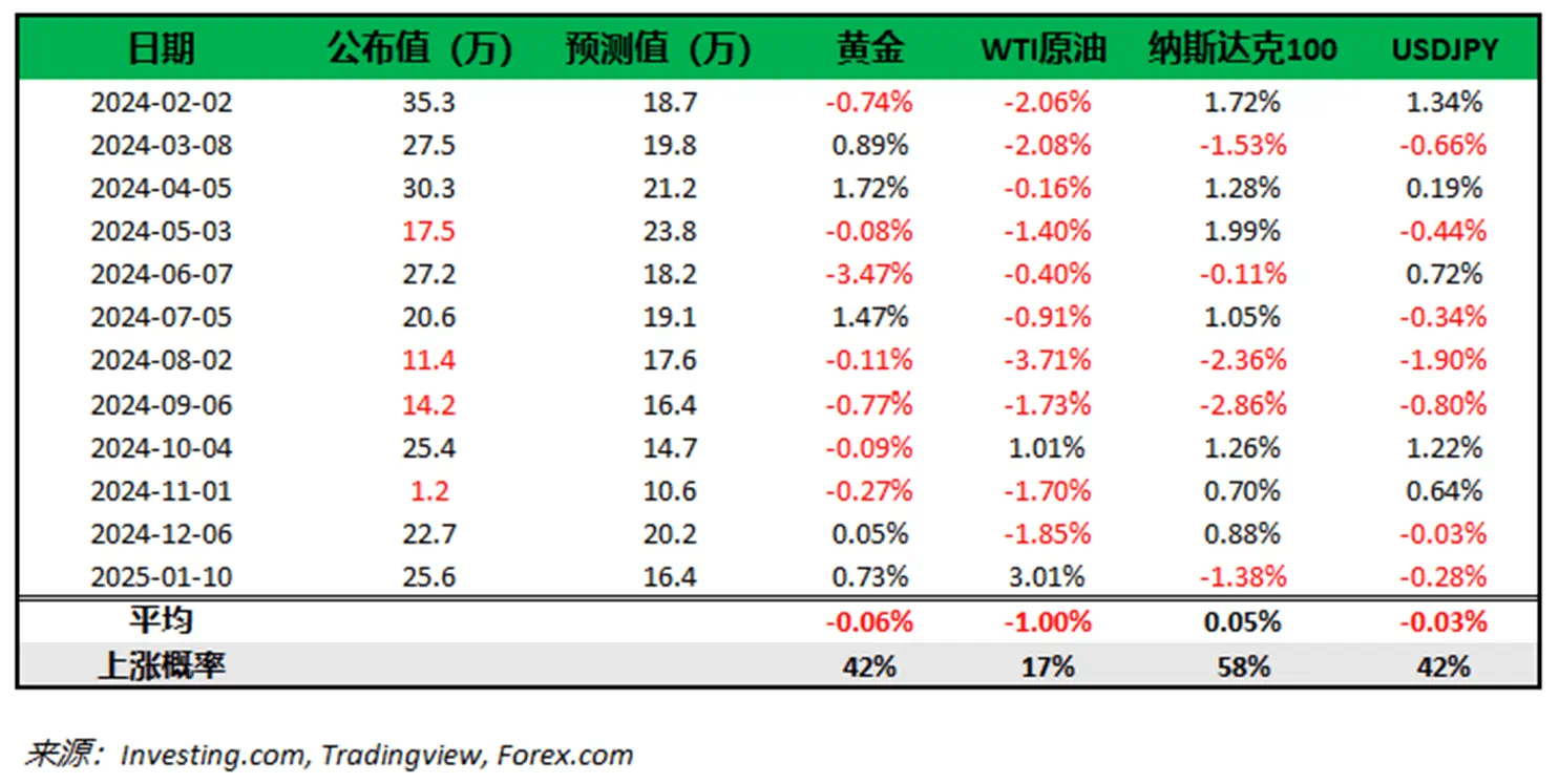 下图为过去12次非农数据以及当日市场表现,仅供参考。