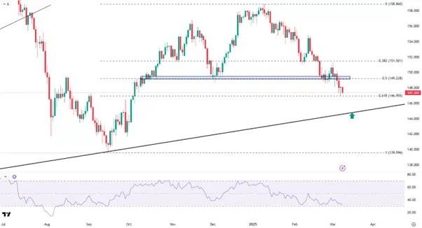 在跌破149的重要支撑后,美/日短线或继续下行,下方的初步缓冲在147一线,其次则是更关键的144-145区域,由于后者是2021年以来的上升趋势线所在的位置,因此可能会引发一定程度的反弹。