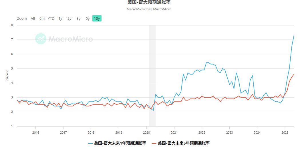 中美关税“休兵”是一段时间以来市场最大的利好,加上美国4CPI低于预期,令美国经济衰退的概率显著降低。不过周五的数据显示,美国消费者信心指数连续第五个月下滑创近三年新低,密歇根大学一年和五年的通胀预期大幅飙升(下图),这提醒着投资者,关税战以及后续影响仍然充满不确定性。