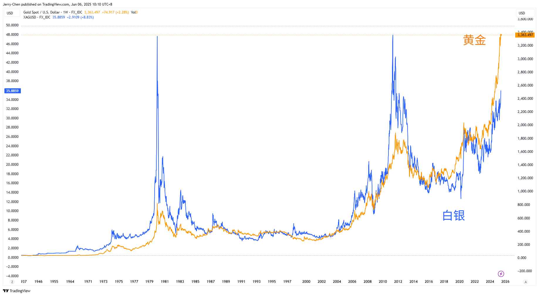 黄金和白银历史走势对比 来源:Tradingview