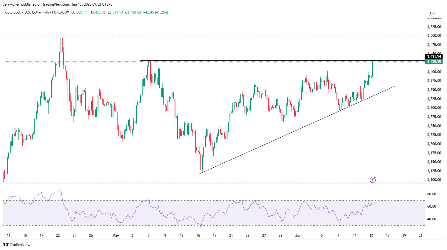 地缘风险帮助黄金打破了过去几周的平静走势,金价周五早盘再次突破3400美元关口,并逼近前高3435